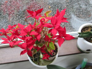 更に、クンシランに混ざってポインセチアもまだまだ元気に赤々としているため