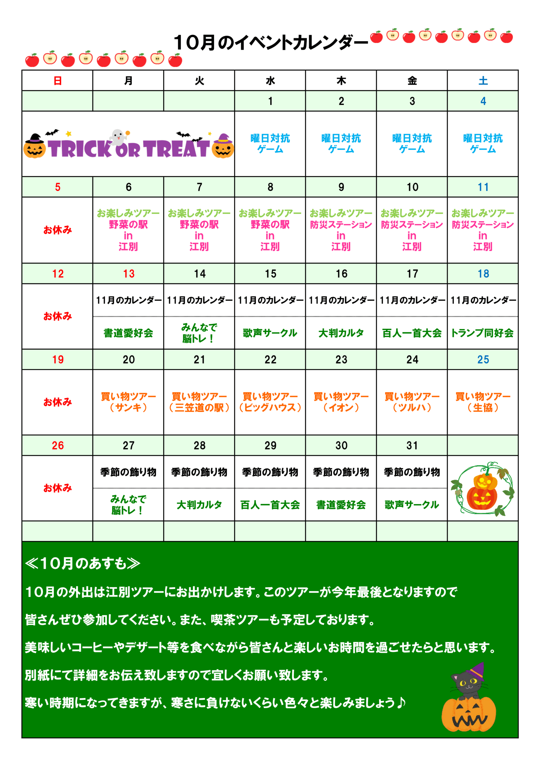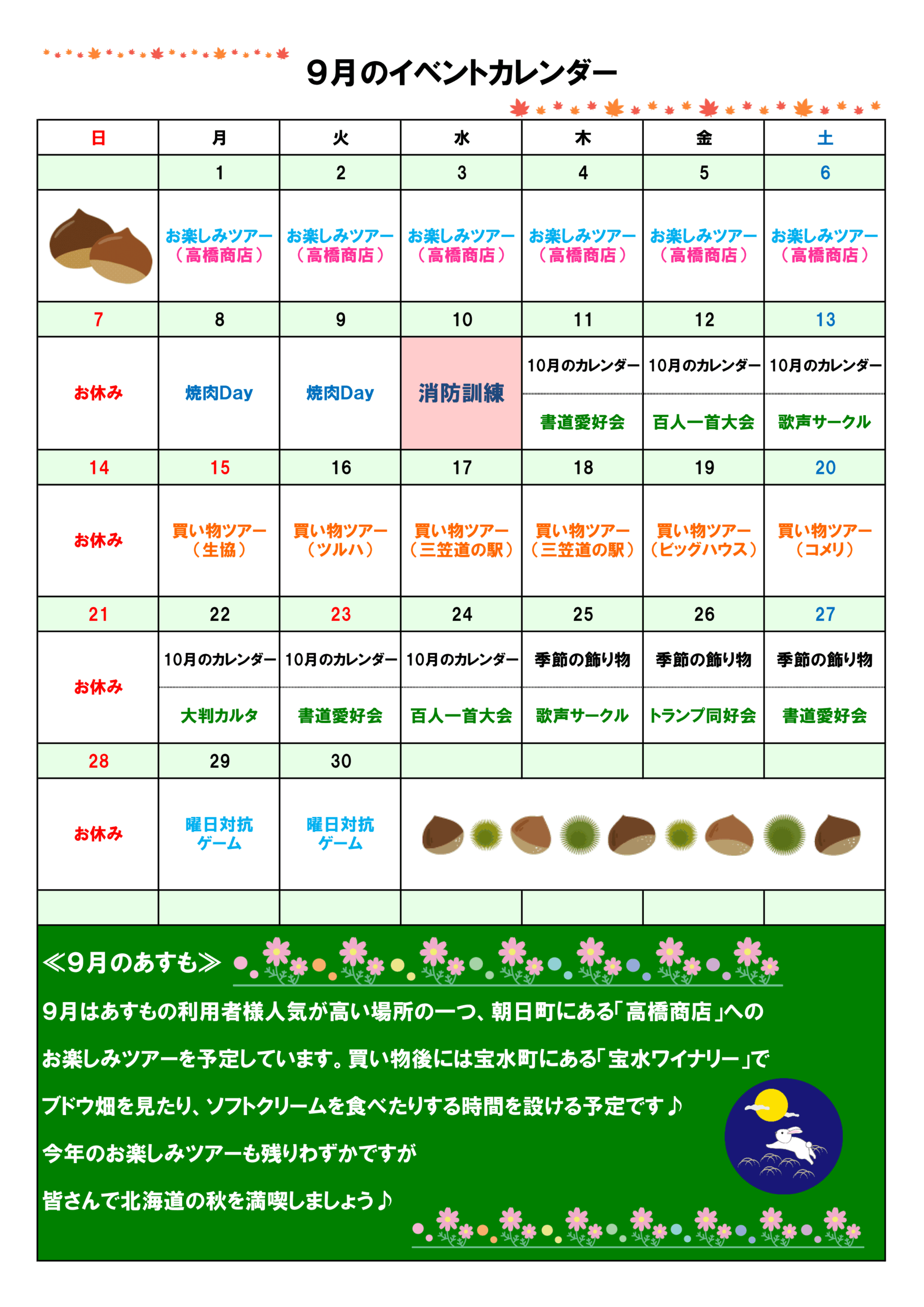 2025年の遠出のお出かけ行事は今月が最後となる予定です。 行き先が週の前半と後半で異なりますが、全日程江別方面へ行きますので 皆様ぜひご参加ください。
